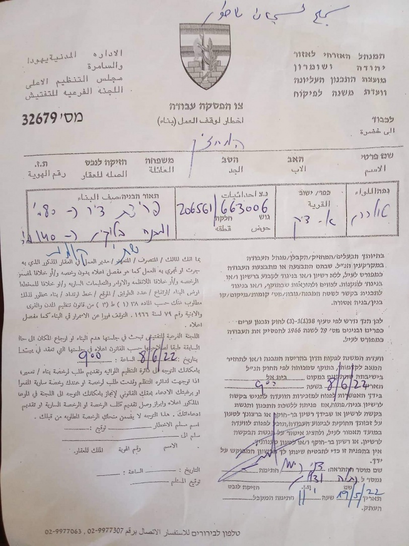 وأضافت أن، "سلطات الاحتلال قامت بوضع اخطارات وقف العمل والبناء لستة منازل ومقهى بالمناطق الشمالية الجنوبية والغربية من البلدة، تعود ملكيتها للمواطنين محمد عفيف علي احمد، عبد الرحيم محمود طه، يونس وجيه الديك، سميح الناطور، آدم مرعي، والمواطن شريف فتحي علي احمد تم تسليمه اخطارين لمنزله وللمقهى".