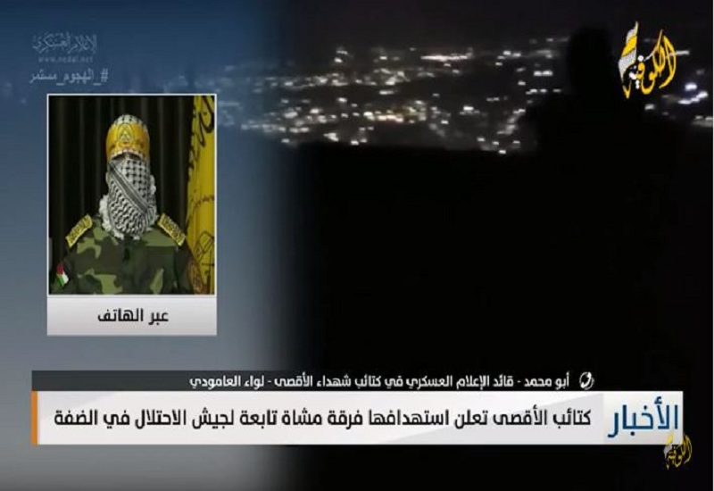 وكانت كتائب شهداء الأقصى "لواء الشهيد نضال العامودي"، الجناح العسكري لحركة فتح، أعلنت عن استهداف فرقة مشاة تابعة لجبش العدو في إحدى مناطق الضفة الفلسطينية ضمن عملية "الهجوم المستمر".