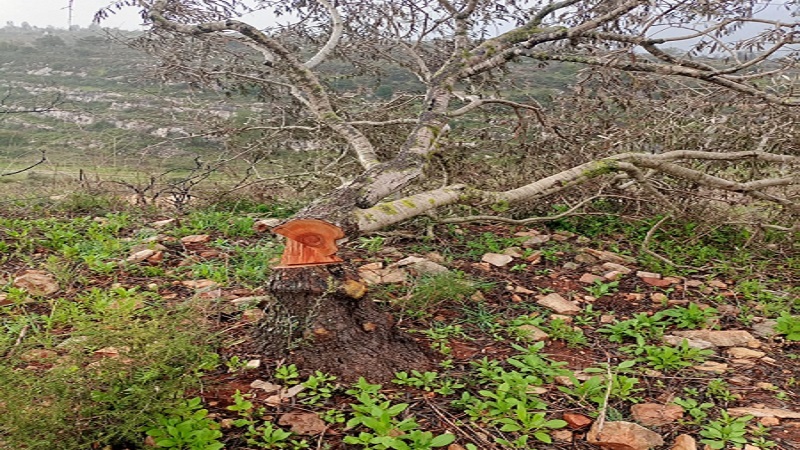 سلفيت: أقدم مستوطنو مستوطنتي راحاليم وتفوح المقامات على اراضي مواطني بلدتي ياسوف والساوية، صباح اليوم، على تقطيع وتكسير عشرات اشجار الزيتون المعمرة شرق سلفيت.