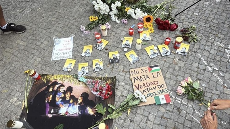 ووضع المشاركون في المظاهرة الزهور على المكان الذي عرضت فيه صور الصحفيين الشهداء، وأشعلوا الشموع.