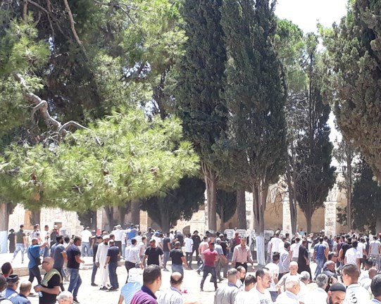 وانتشر عشرات عناصر الشرطة الإسرائيلية المدججين بالسلاح في ساحات المسجد، خاصة قبالة المسجد القبلي المسقوف.