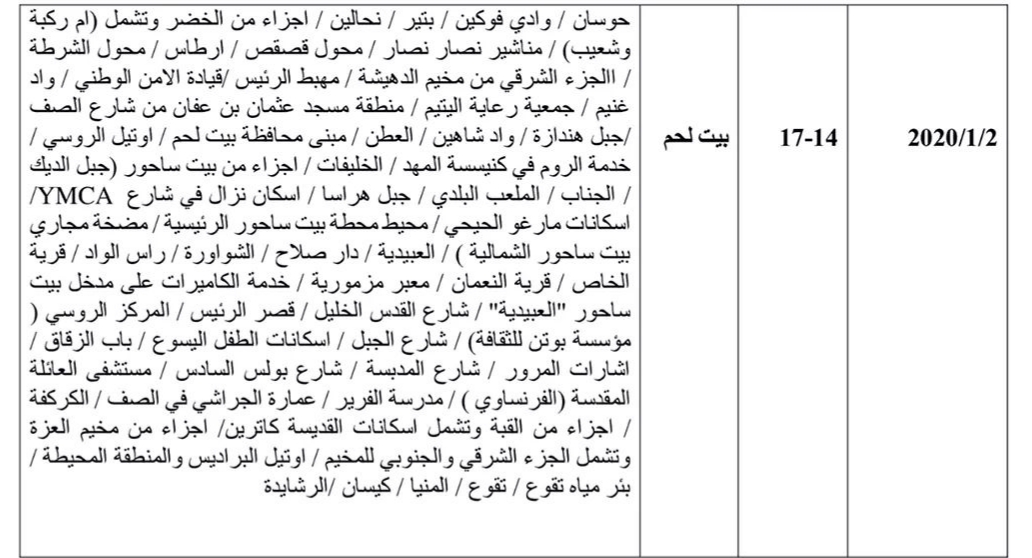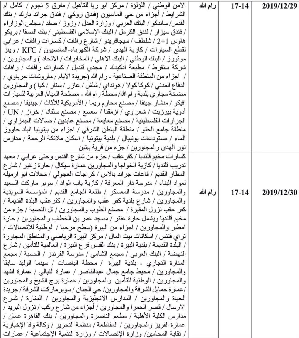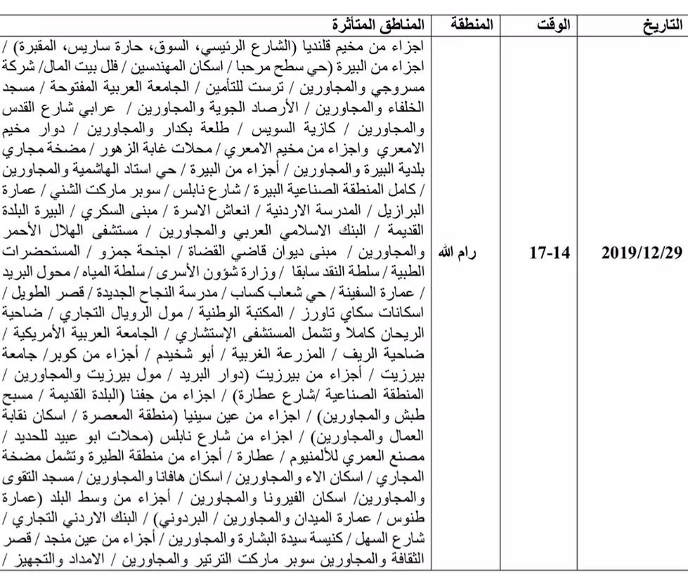 وستمتد الجولة الخامسة على مدار الأسبوع المقبل، بين يومي الأحد 29 كانون الأول الجاري والخميس 2 كانون الثاني 2020، وستكون فترة القطع لثلاث ساعات بين الساعتين الثانية والخامسة مساءً.