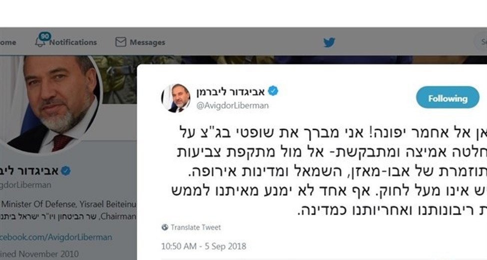 القدس المحتلة: بعد صدور قرار المحكمة "العليا" الإسرائيلية، اليوم الأربعاء، بإخلاء وهدم قرى الخان الأحمر شرق المدينة المقدسة، غرّد وزير جيش الاحتلال أفيغدور ليبرمان على "تويتر" بمباركته الإخلاء وتهجير أهالي قرى الخان.