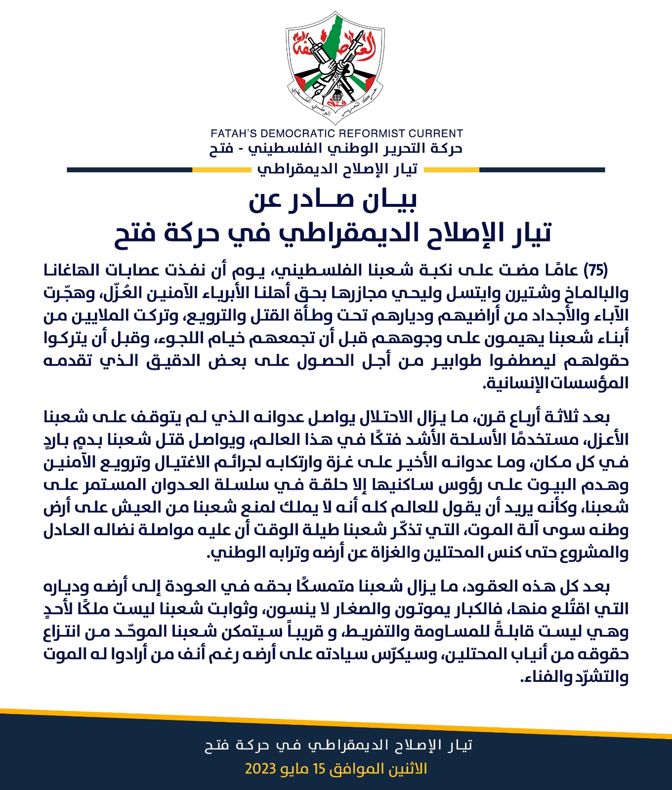 أصدر تيار الإصلاح الديمقراطي في حركة فتح، بيانا يحيي فيه ذكرى النكبة الـ"75"، على الشعب الفلسطيني.