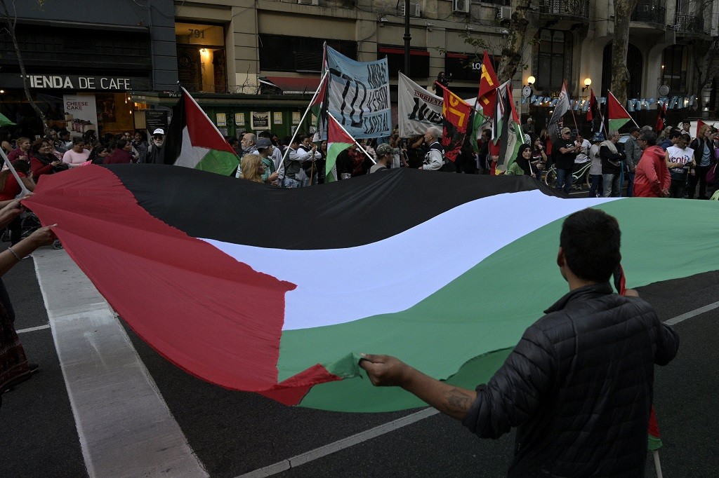 نظم ممثلو مؤسسات مجتمعية وحقوقية أرجنتينية وأبناء الجالية الفلسطينية والعربية، الليلة، تظاهرة أمام السفارة الإسرائيلية في العاصمة بوينس آيرس، تنديدا بجرائم الاحتلال بحق الشعب الفلسطيني وإحياء للذكرى الـ75 للنكبة.