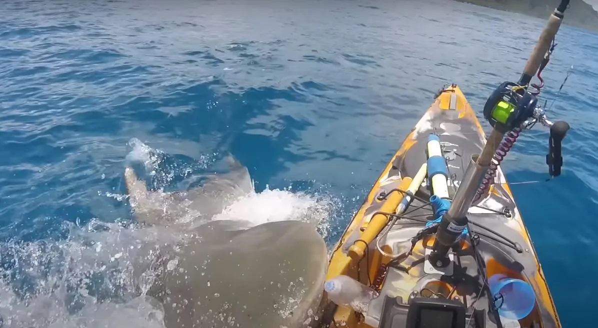 ويُظهر الفيديو سمكة "قرش النمر" الكبيرة تقترب خلسة من حافة زورق الكاياك، قبل أن تفتح فكها لالتهام الجانب الأيسر لقارب الكاياك.