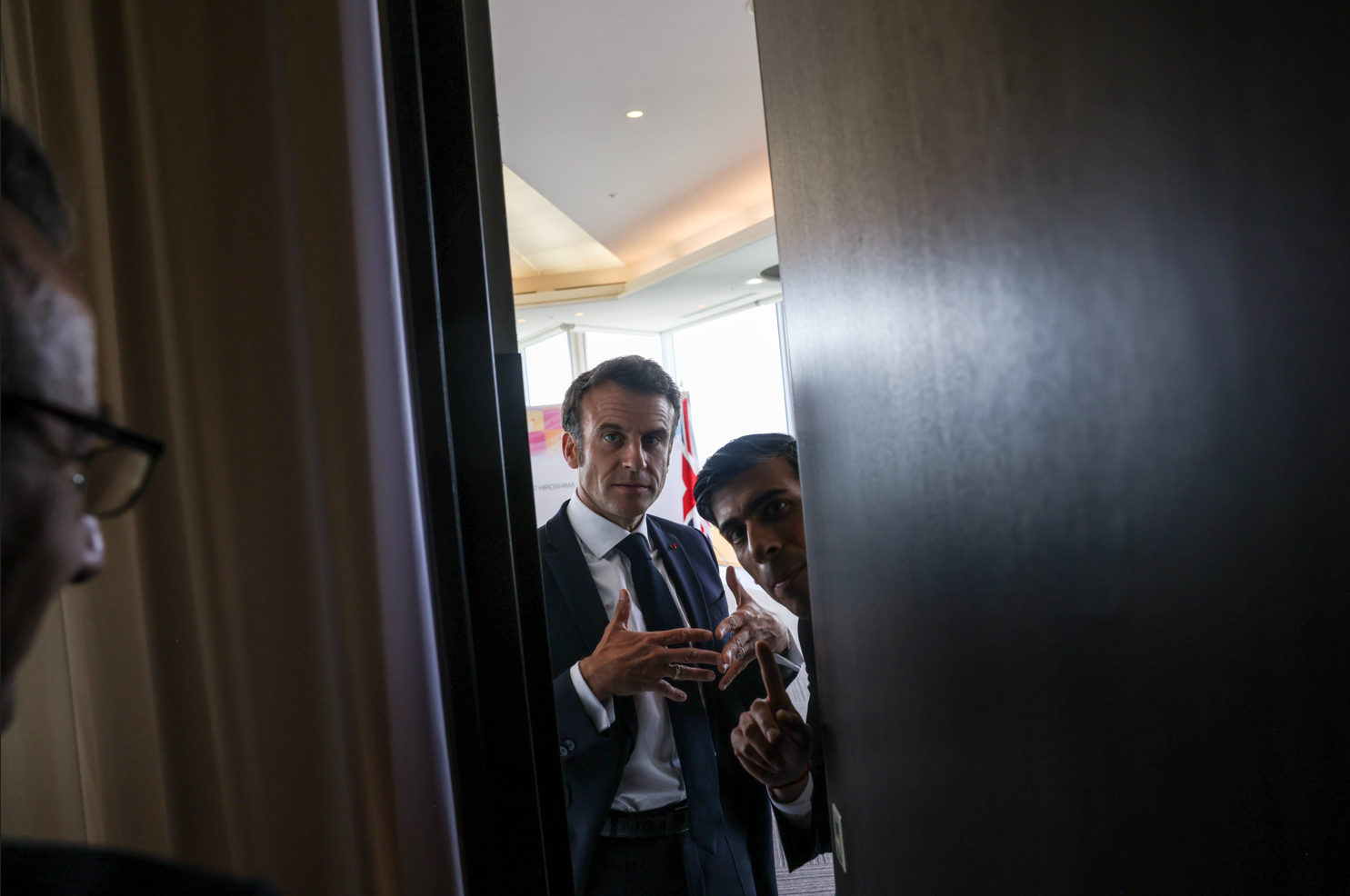 وظهر ماكرون وسوناك في الصورة وهما خلف أحد الأبواب ويتحدثان إلى شخص ثالث.