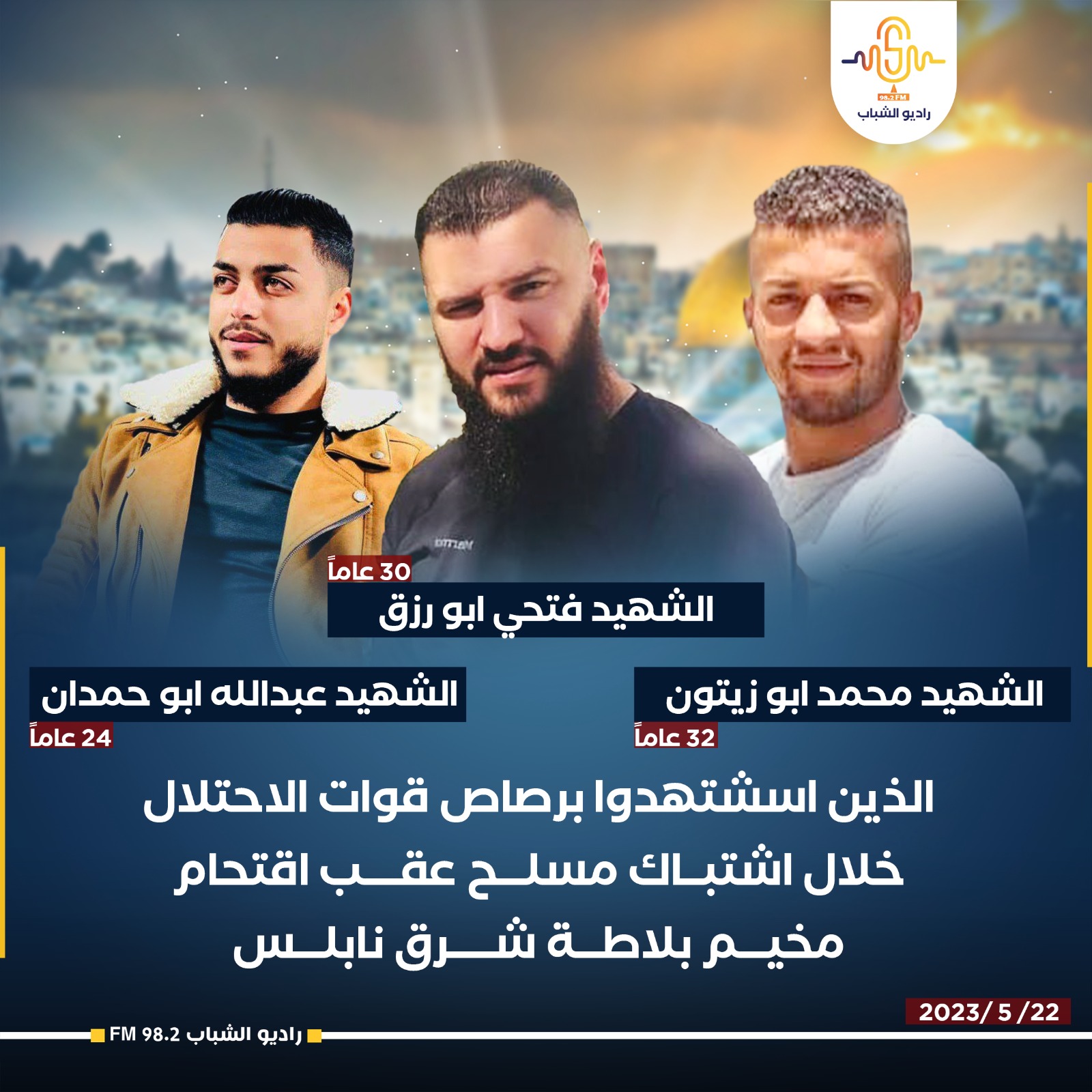 وكانت قوات كبيرة من جيش الاحتلال قد اقتحمت مخيم بلاطة فجر اليوم، وسط إطلاق كثيف للرصاص واندلاع مواجهات عنيفة، الأمر الذي أدى إلى استشهاد الشبان الثلاثة، وإصابة ستة آخرين على الأقل، جروح أحدهم حرجة، وتفجير عدد من المنازل.