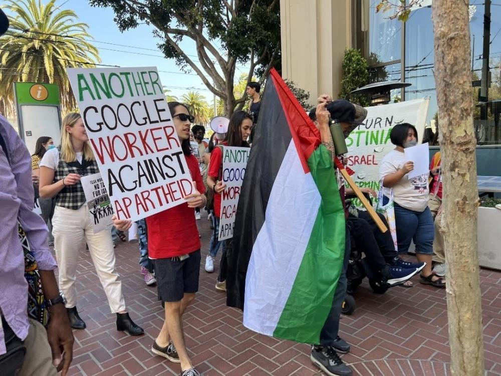 شارك المئات من موظفي شركة "غوغل" وأنصار الحق الفلسطيني، في تظاهرة في مدينة سان فرانسيسكو بولاية كاليفورنيا، تضامنًا مع الشعب الفلسطيني، واحتجاجًا على انعقاد المؤتمر السنوي لتكنولوجيا الغيوم للشركة.