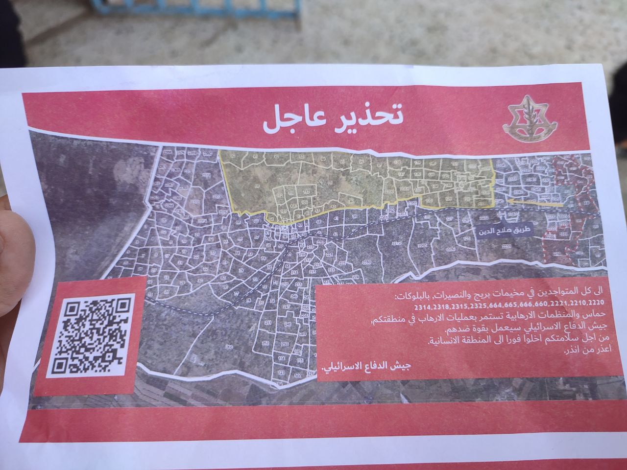 وألقت طائرات مسيرة إسرائيلية منشورات تحذيرية للسكان المتواجدين في 9 مناطق في مخيمي النصيرات والبريج وسط القطاع تطالبهم بالإخلاء الفوري، والتوجه إلى ما يُسمّى بـ"المنطقة الإنسانية".