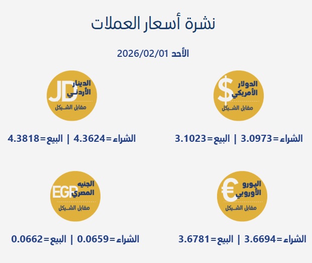 الكوفية رام الله - جاءت أسعار صرف العملات مقابل الشيقل الإسرائيلي، اليوم الاحد، بحسب سلطة النقد الفلسطينية، على النحو التالي: