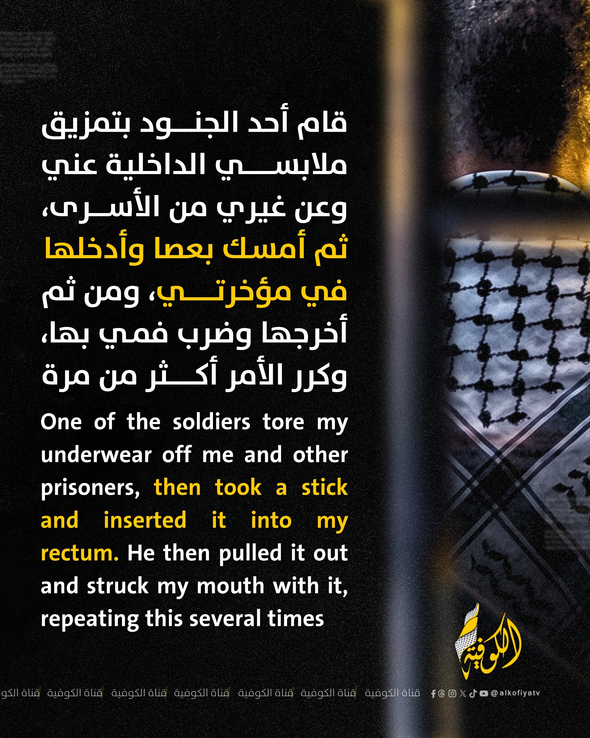 الكوفية في فصولٍ جديدة من "الهمجية" التي تجاوزت كل الحدود الأخلاقية والإنسانية، تخرج من وراء قضبان الاحتلال شهادات لأسرى محررين تزلزل الوجدان.