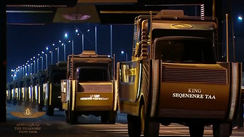 وانطلقت العجلات الحربية حاملة المومياوات، التي وضعت كل منها داخل كبسولة خاصة معبأة بالنيتروجين لضمان حمايتها.