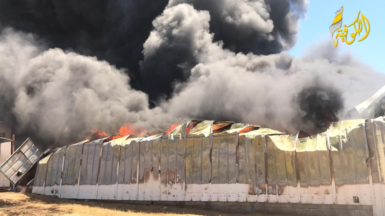 خاص بالفيديو والصور|| حريق ضخم جراء قصف مدفعي على مستودع للدهانات شمال رفح