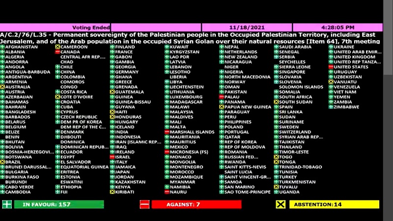 أما القرار المعنون "القدس" أو A/76/L.16 فقد صوت لصالحه 129 عضوا، وعارضه 11 وامتنع عن التصويت 31 عضوا. ويحث هذا القرار الذي قدمت مشروعه مصر أيضا على وقف التحريض خاصة في المواقع ذات الحساسية الدينية مع ضرورة الحفاظ على الوضع التاريخي والقانوني القائم في المدينة.