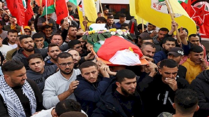 رام الله: شيَّع الآلاف من المواطنين، بقرية دير أبو مشعل في رام الله، جثمان الشهيد الفتى محمد ضامر مطر، 16 عامًا.