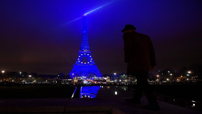 وفي خطوة ترمز إلى هذا الانتقال أنير برج إيفل وقصر الإليزيه باللون الأزرق الأوروبي.