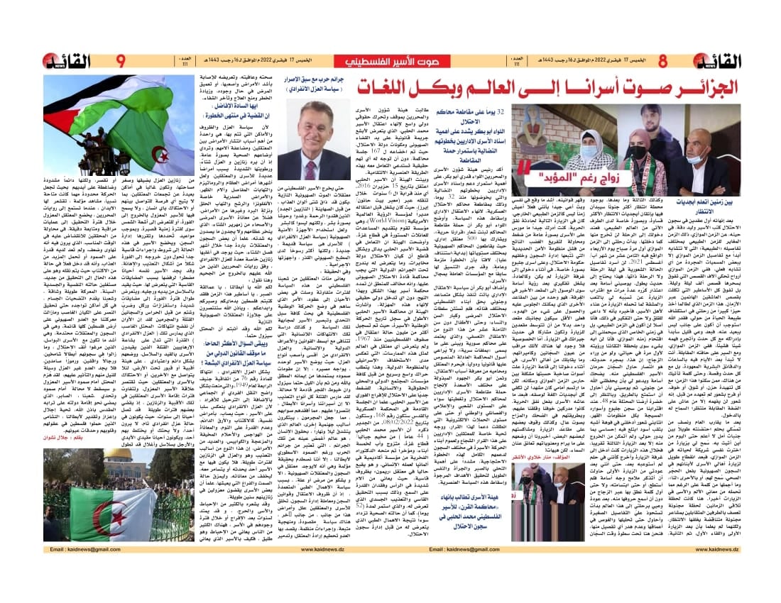 الجزائر: تواصل الصحف الجزائرية عرض قضية أسرانا البواسل، عبر ملاحق أسبوعية مخصصة لعرض مآسي الأسرى في سجون الاحتلال الإسرائيلي.