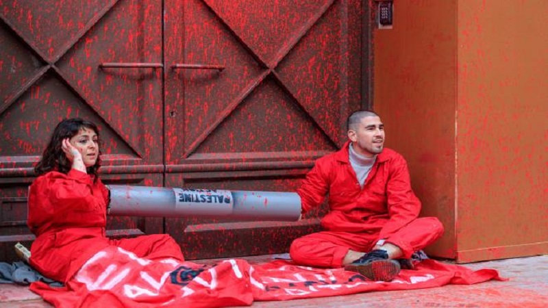 وقام نشطاء من حركة العمل الفلسطيني بتقييد أنفسهم أمام مدخل المبنى الواقع في «77 شارع كينجزواي» ودهنوا الباب بصبغة حمراء تمثل دماء الفلسطينيين، الذين قتلوا على يد الجيش الإسرائيلي.