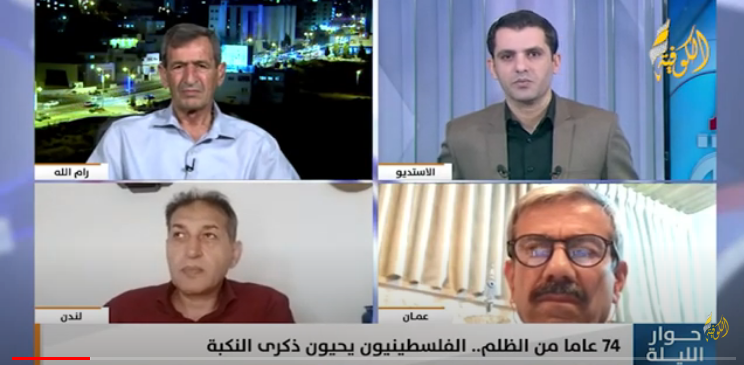 وأضاف،خلال لقائه في برنامج "حوار الليلة"على قناة "الكوفية"، أن ذكري النكبة الفلسطينية تأتي في ظل التصعيد الإسرائيلي المتواصل على أبناء شعبنا في القدس والضفة وقطاع غزة، مشيرا إلى أن حالة الفعل الفلسطيني المتسلح بالمقاومة والتحدي لمواجهة الاحتلال مستمرة، وذلك من أجل إقرار الحقوق السياسية للشعب الفلسطيني في كافة المحافل الدولية.