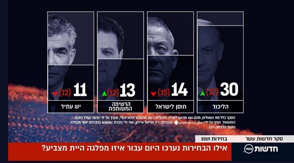 متابعات|| قال تلفزيون الاحتلال الإسرائيلي في استفتاء أجري أمس الأحد ونشرت نتائجه اليوم الإثنين، إن حزب الليكود لا يزال يتربع على قائمة الأحزاب الأقوى بـ 30 مقعداً، مشيراً إلى أن حزب " تحصين إسرائيل" بزعامة رئيس هيئة الأركان الأسبق، بيني غانتس، حصل بدوره على 14 مقعداً، فيما حصلت القائمة العربية المشتركة على 13 مقعداً، وحزب "يوجد مستقبل" على 11 مقعداً.