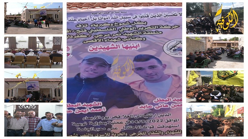 جنين: قدم مئات المواطنين، يتقدمهم مقاتلي كتائب شهداء الأقصى الجناح العسكري لحركة فتح، اليوم الأربعاء، واجب العزاء في منفذي عملية حاجز الجلمة شمال محافظة جنين، الشهيدين عبد الرحمن وأحمد عابد.