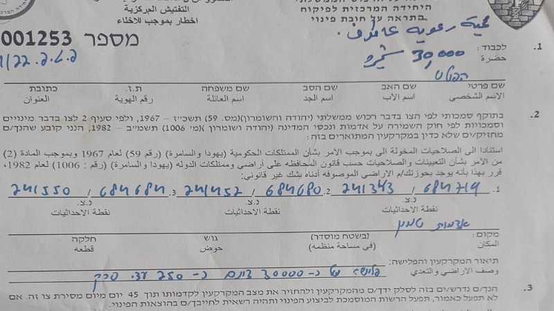 وأضاف بشارات، أنه "تم العثور على الإخطار داخل الأرض اليوم، علما أن التاريخ المدون عليه هو 6 أكتوبر/ تشرين الأول 2022"، مبينًا أن سلطات الاحتلال تضع الإخطارات داخل الأراضي دون تسليمها مباشرة، وعادة يعثر عليها المواطنون خلال عملهم في الأراضي.