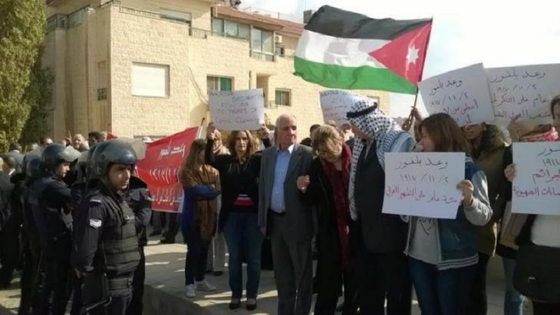 وقال رئيس التجمع الوطني للمستقلين منيب المصري، إنه يقف أمام القنصلية البريطانية لنقول لبريطانيا أنها ارتكبت جريمة بإعلانها عن وعد بلفور.