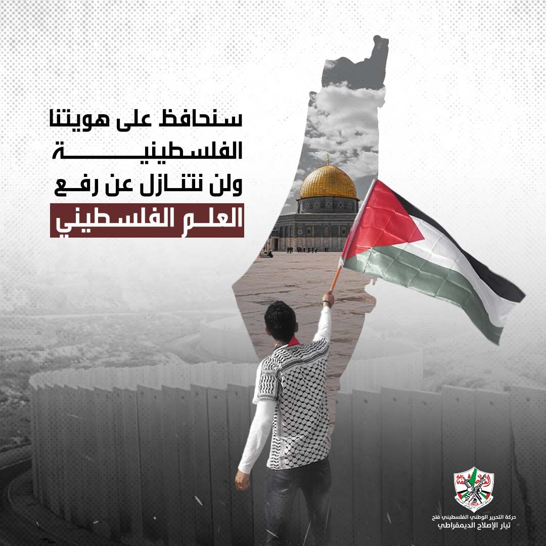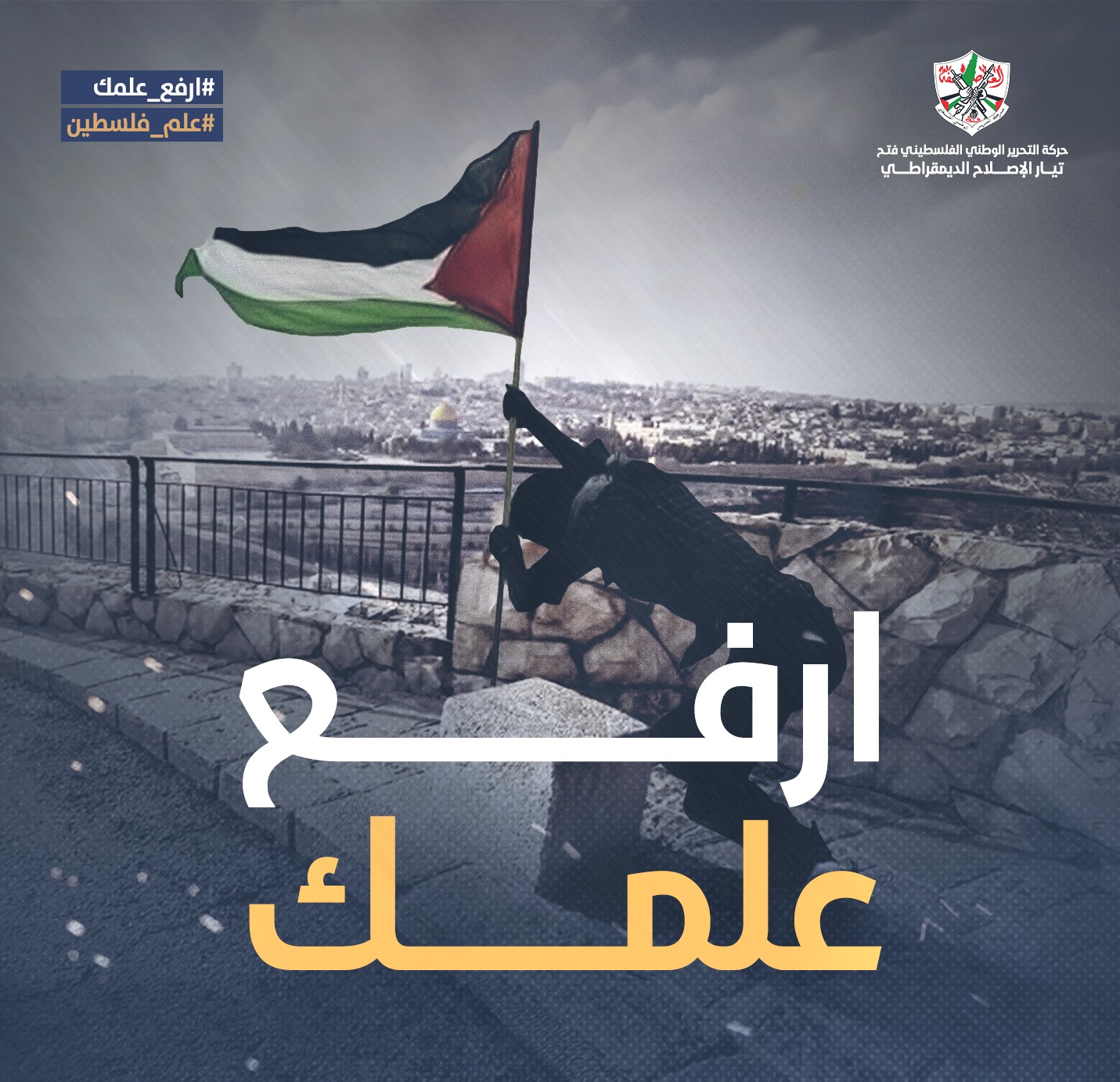 ودعا التيار كل مكوناته وكوادره ونشطاء مواقع التواصل الاجتماعي ومختلف أطياف الشعب الفلسطيني، للمشاركة والتغريد على هاشتاغ #ارفع_علمك، #علم_فلسطين، تحديًا للقرار العنصري الذي يستهدف القضية الفلسطينية، ولدعم الحملات الشبابية التي تدعو لرفع علم فلسطين والتوشح بالكوفية الفلسطينية.