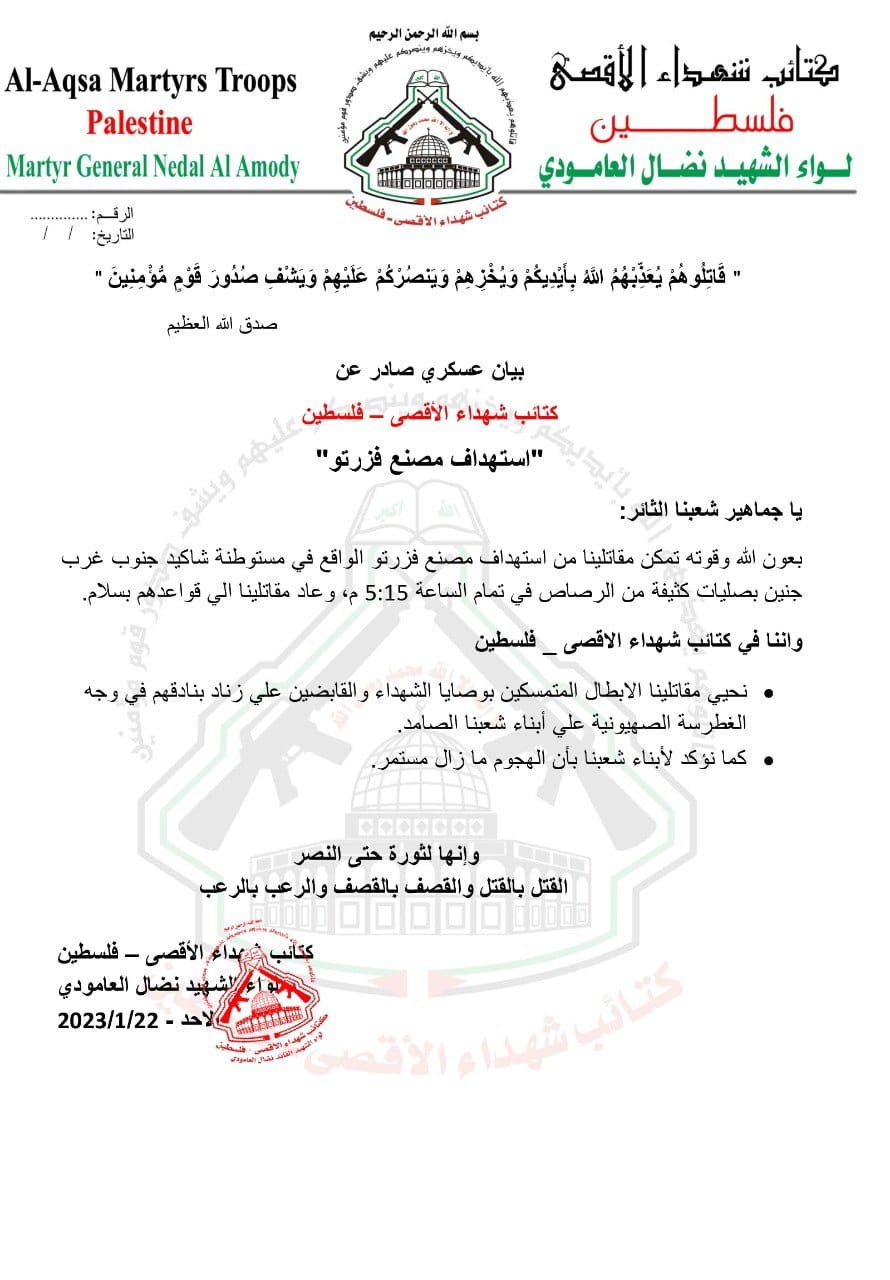وقالت كتائب الأقصى في بيان وصل الكوفية نسخة عنه، " بعون الله وقوته تمكن مقاتلينا من استهداف مصنع فزرتو الواقع في مستوطنة شاكيد جنوب غرب جنين، بصليات كثيفة من الرصاص، في تمام الساعة 5:15 مساءً، وعاد مقاتلينا إلي قواعدهم بسلام. وأكدت ان مقاتليها متمسكين بالمقاومة، عملًا بوصايا الشهداء، والقابضين علي زناد بنادقهم في وجه الغطرسة الصهيونية علي أبناء شعبنا الصامد".