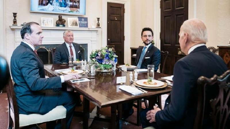 وأكّد العاهل الأردني خلال اللقاء، أهمية تكثيف الجهود لدعم الشعب الفلسطيني في نيل حقوقه العادلة والمشروعة، وقيام دولته المستقلة، على حدود الرابع من حزيران عام 1967، وعاصمتها القدس الشرقية لتعيش بأمن وسلام إلى جانب "إسرائيل".