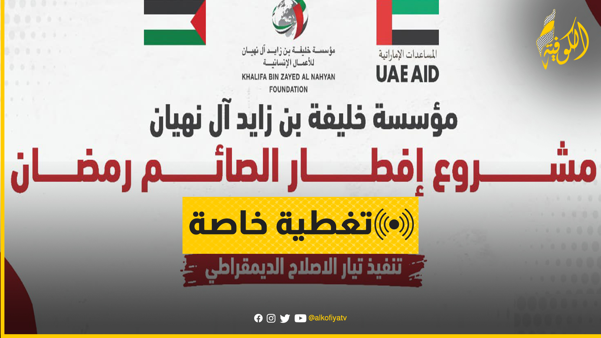الكوفية غزة: دعا تيار الإصلاح الديمقراطي في حركة فتح ساحة غزة، ومؤسسة خليفة بن زايد آل نهيان للاعمال الإنسانية، وسائل الإعلام لتغطية وقائع المؤتمر الصحفي المقرر عقده يوم غد السبت للإعلان عن انطلاق مشروع "افطار الصائم" للعام 2023م-1444هـ في قطاع غزة.