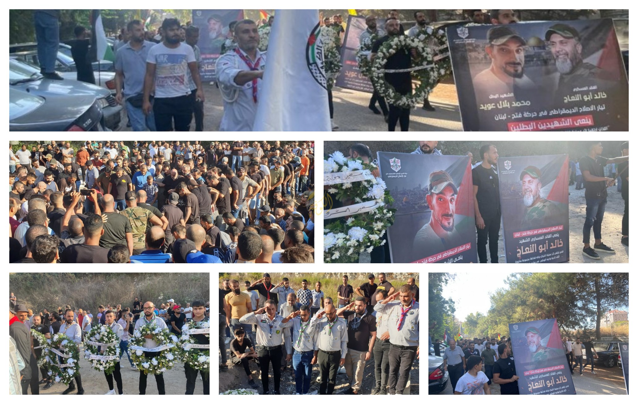 الكوفية صبدا: شيعت حركة التحرير الوطني الفلسطيني فتح ح تيار الاصلاح الديمقراطي الشهيد القائد خالد ابو النعاج والشهيد البطل محمد عويد بمشاركة أمين سر اقليم حركة فتح وقائد قوات الأمن الوطني وفصائل منظمة التحرير الفلسطينية.