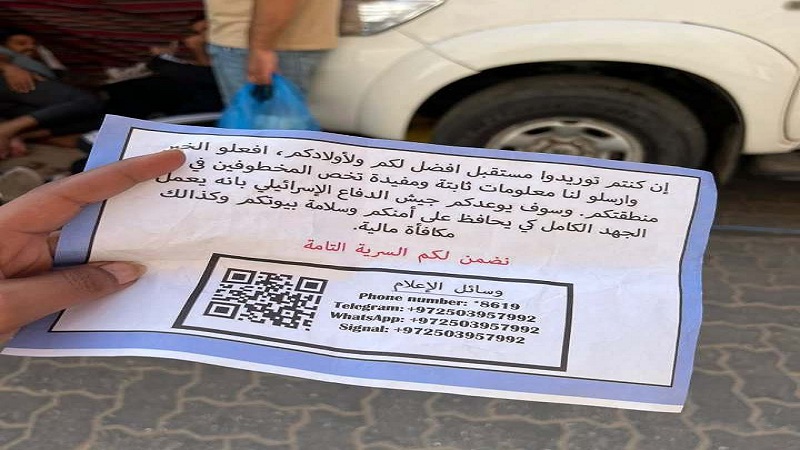 وقال جيش الاحتلال في المنشور، «إن كنتم تريدون مستقبل أفضل لكم ولأولادكم، افعلوا الخير وأرسلوا لنا معلومات ثابتة ومفيدة تخص المخطوفين في منطقتكم».