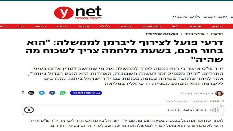 ترجمة خاصة للكوفية: يسعى رئيس حزب "شاس" أريه أدرعي، لضم رئيس حزب "إسرائيل بيتنا" أفيغدور ليبرمان إلى الائتلاف الحكومي رغم معارضة "الحريديم" لتوليه أي منصب وزاري.