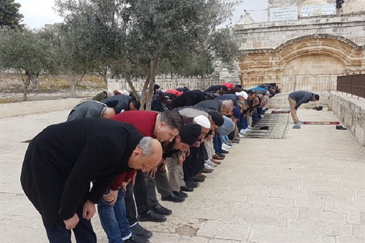 من جانبهم، أدى مقدسيون صلاة الظهر جماعة عند باب الرحمة في الجزء الشرقي داخل المسجد المبارك.