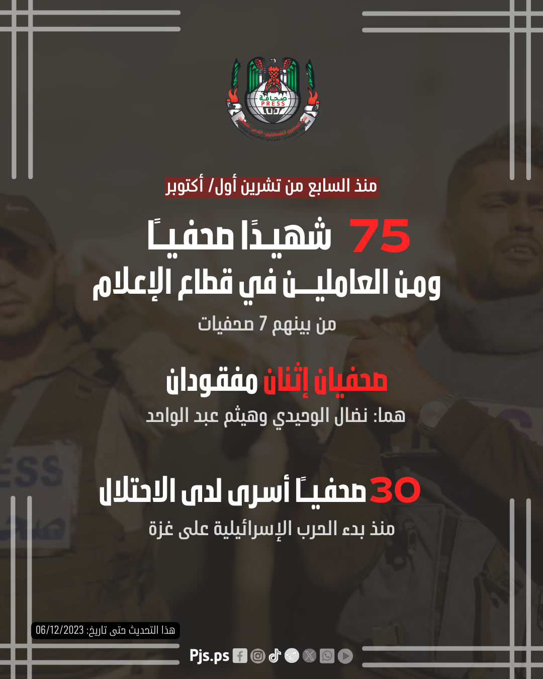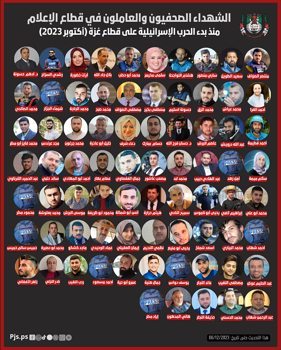 وأوضحت في تقرير صادر عنها اليوم الأربعاء، إن 75 صحفياً وعاملاً في قطاع الإعلام استشهدوا، وأصيب نحو 80 صحفياً بجروح، وفقد صحفيان اثنان، بينما قصف الاحتلال منازل عائلات 60 صحفياً، ودمر مقار 63 مؤسسة ومكتبا صحفي، وعطل عمل 25 إذاعة محلية (24 في غزة وواحدة في الضفة)، وأغلق وقيد عمل 3 وسائل إعلامية، واعتقل 43 صحفيا منهم 41 في الضفة واثنان في غزة، حيث لا زال منهم 30 قيد الاعتقال، وأغلبهم تم تحويلهم للاعتقال الإداري.