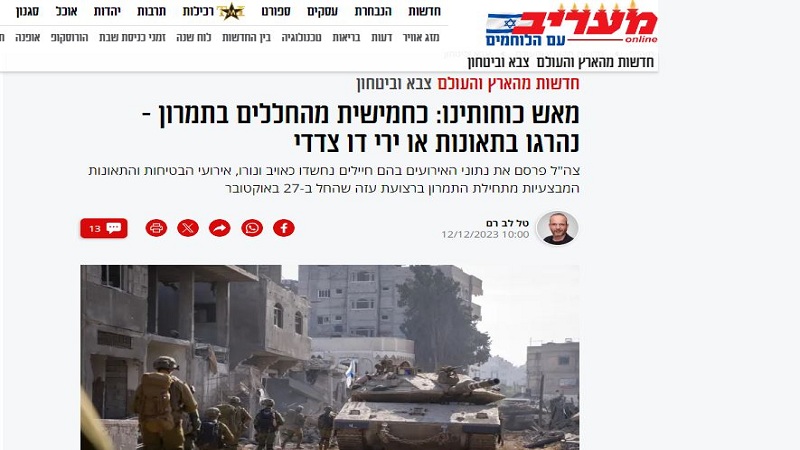 وذكرت صحيفة "معاريف" العبرية، أن الجيش نشر بيانات كارثية بشأن سقوط قتلى من الجنود في غزة قتلوا بنيران صديقة أو عن طريق الخطأ في تحديد الهدف خلال القتال الدائر في غزة.