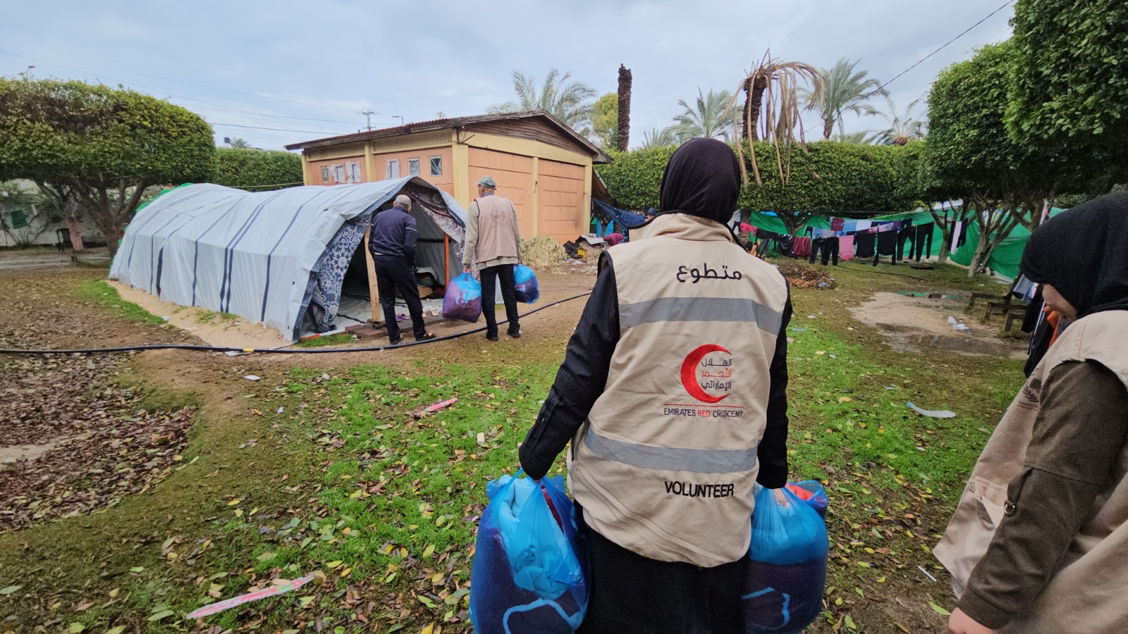غزة: وزع متطوعو الهلال الأحمر الإماراتي، واللجنة الوطنية للشراكة والتنمية، الأغطية الشتوية "بطانيات" وحرامات شتوية"، على النازحين في المخيمات المقامة حديثاً في مدينة دير البلح، ضمن عملية الفارس الشهم 3 الإماراتية التي تعمل على تعزيز الجانب الإنساني والإغاثي، في قطاع غزة.