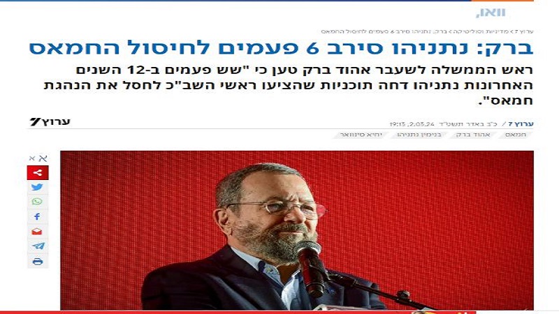 القناة السابعة: إيهود باراك: نتنياهو رفض 6 مرات القضاء على حماس
