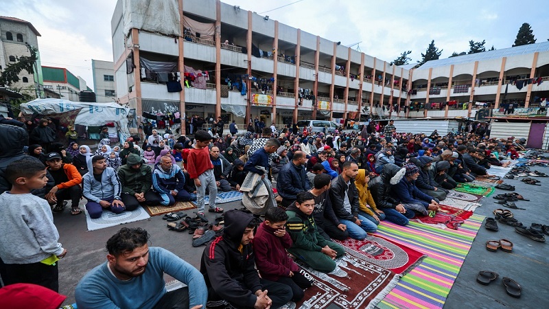 وفي مخيم جباليا شمال القطاع، أدى عدد من المواطنين صلاة العيد في الساحات العامة، في ظل هطول الأمطار والأجواء الباردة.