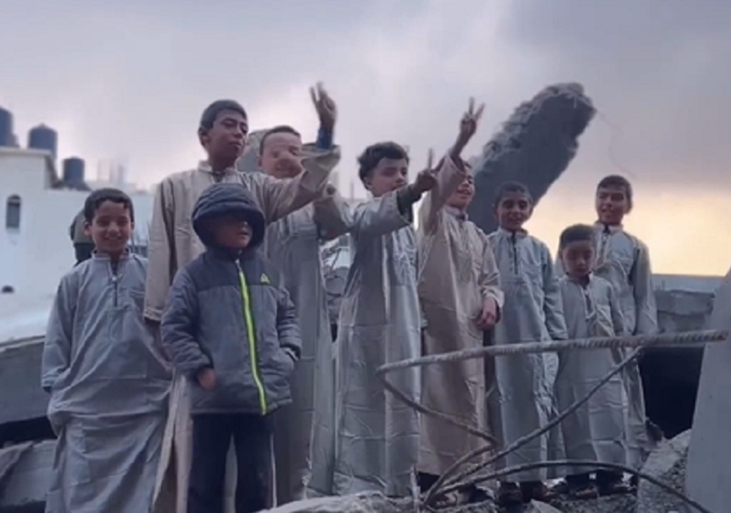 كان هذا هو المشهد الأول، أما الثاني فكان أعظم، حيث اصطف الأطفال على أنقاض منازلهم المدمرة مرتدين ثياب العيد وهو يرددون تكبيرات العيد "الله أكبر ولله الحمد" مختتمين تكبيراتهم بالتلويح بعلامات النصر، في مشهد يجسد إيمانهم بالله وبالنصر في وجه حرب الإبادة الشيطانية التي يشنها الاحتلال عليهم على مدار 6 أشهر متواصلة.