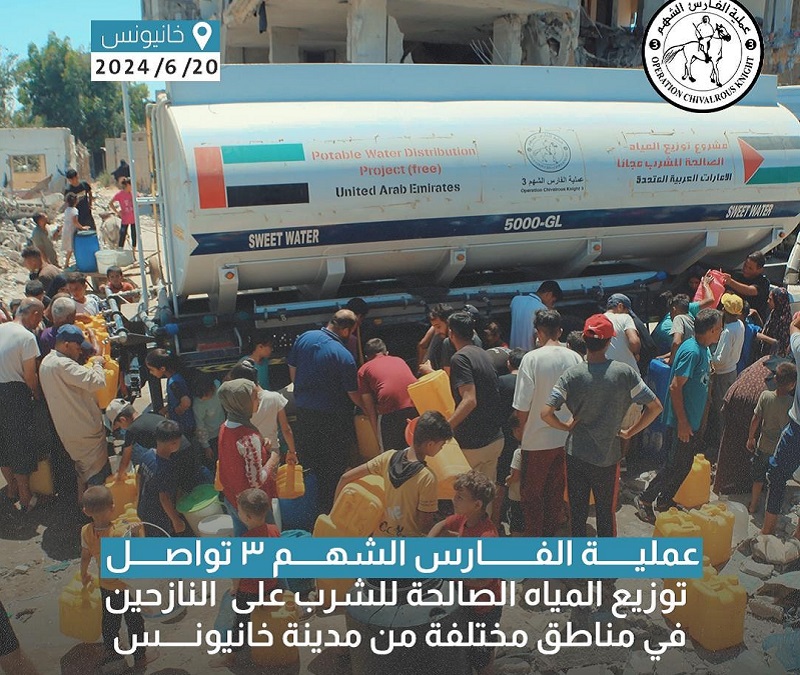 واصلت عملية "الفارس الشهم" عمليات توزيع المياه الصالحة للشرب على خيام النازحين في مدينة خان يونس جنوب قطاع غزة.