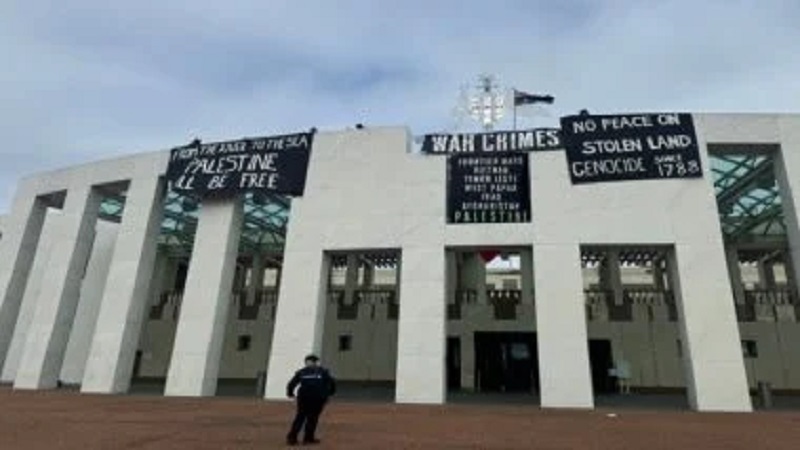 وذكرت وسائل إعلام أسترالية، أن 4 متظاهرين على الأقل تسلقوا إلى قمة مبنى البرلمان في كانبيرا لرفع لافتات مؤيدة لفلسطين، وسمعت هتافاتهم في الأرجاء.