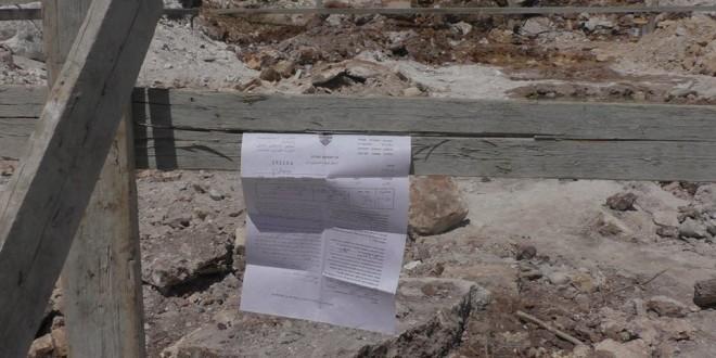الخليل:  أخطرت سلطات الاحتلال الإسرائيلي، اليوم الثلاثاء، بهدم غرفة زراعية وحظيرة أغنام في قرية التبان بمسافر يطا جنوب الخليل.