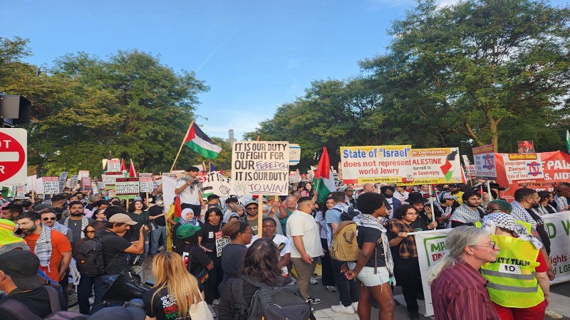 وواصل النشطاء الذين يمثلون منظمات إنسانية وحقوقية وجمعيات مدنية واتحادات عمالية وطلابية، مظاهراتهم واعتصامهم أمام مقر انعقاد المؤتمر في مدينة شيكاغو بولاية إلينوي لليوم الخامس على التوالي، للمطالبة بوقف الحرب في القطاع وإنهاء الابادة الجماعية المستمرة منذ أكثر من عشرة أشهر.