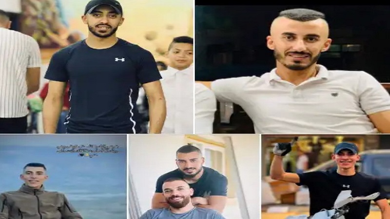 والشهداء هم: أحمد فواز فايز أبو دواس، 24 عاما، ومحمد عوض سالم أبو جمعة، 30 عاما، وقصي مجدي عبد الله عبد الرازق، 26 عاما، ومحمد نظمي أبو زاغة، 23 عاما، ومحمد زكريا محمد الزبيدي،21 عاما، نجل الأسير زكريا الزبيدي.