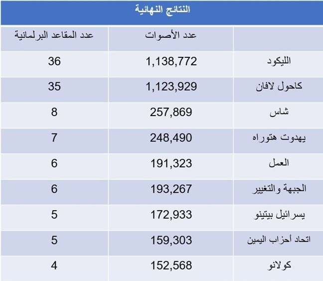 واظهرت النتائج حصول الليكود على 36 مقعدًا وحصل حزب "كاحول لافان" على 35 مقعدًا وشاس على 8 من أصل 120 مقعدا.