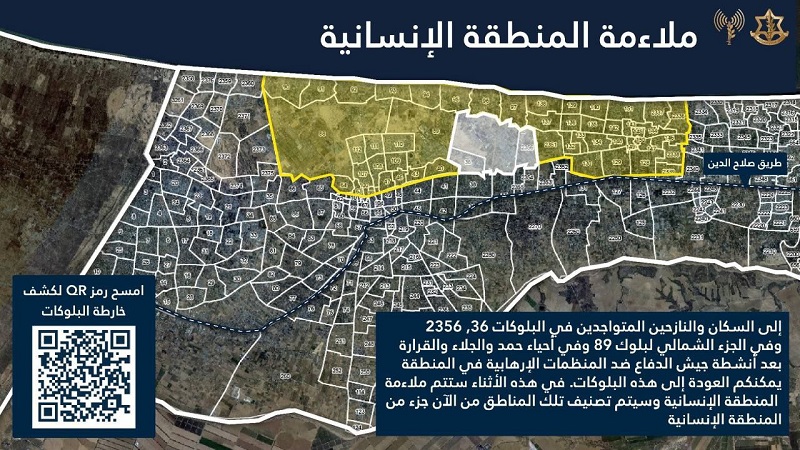 ودعا السكان إلى إخلاء هذه المناطق فورًا نحو المنطقة الإنسانية المستحدثة في المواصي"، زاعمًا أن "شارع صلاح الدين متاح أمامهم كمحور انتقال إنساني نحو منطقة جنوب قطاع غزة، وسيكون مفتوحًا للانتقال بين الساعات 08:00-17:00".