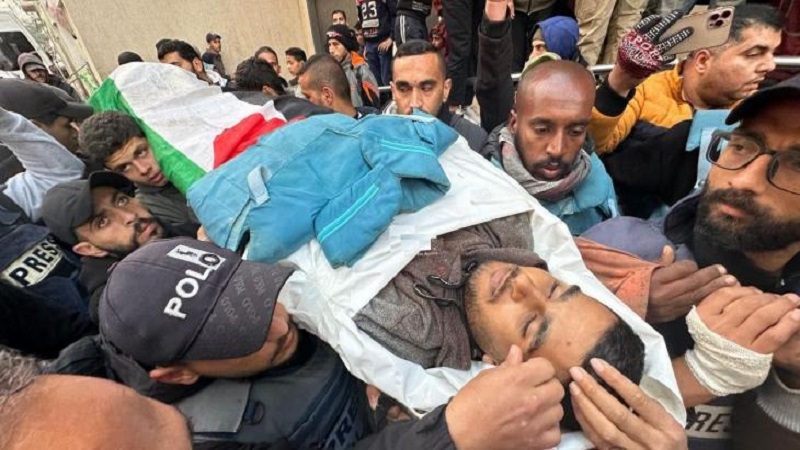 وطالب جموع من الصحفيين خلال تشيعه المجتمع الدولي بتوفير الحماية لهم، مشددين على أنهم مستمرون في تأدية واجبهم بنقل الحقيقة وفضح جرائم الاحتلال في غزة حتى لو بقي منهم صحفي واحد.